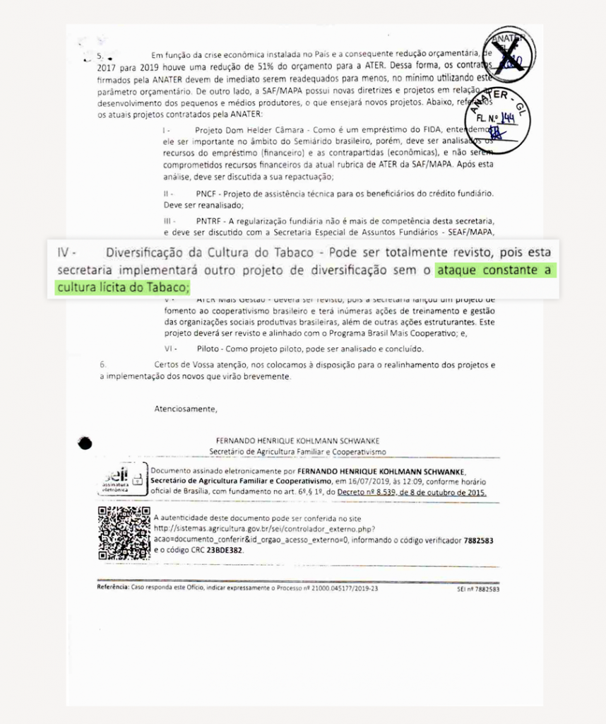 In 2019, the Jair Bolsonaro administration suspended the diversification program, calling it “a constant attack on the lawful culture of tobacco, ” according to a letter from the Ministry of Agriculture at the time, reviewed by Joio. The initiative has been frozen ever since.
